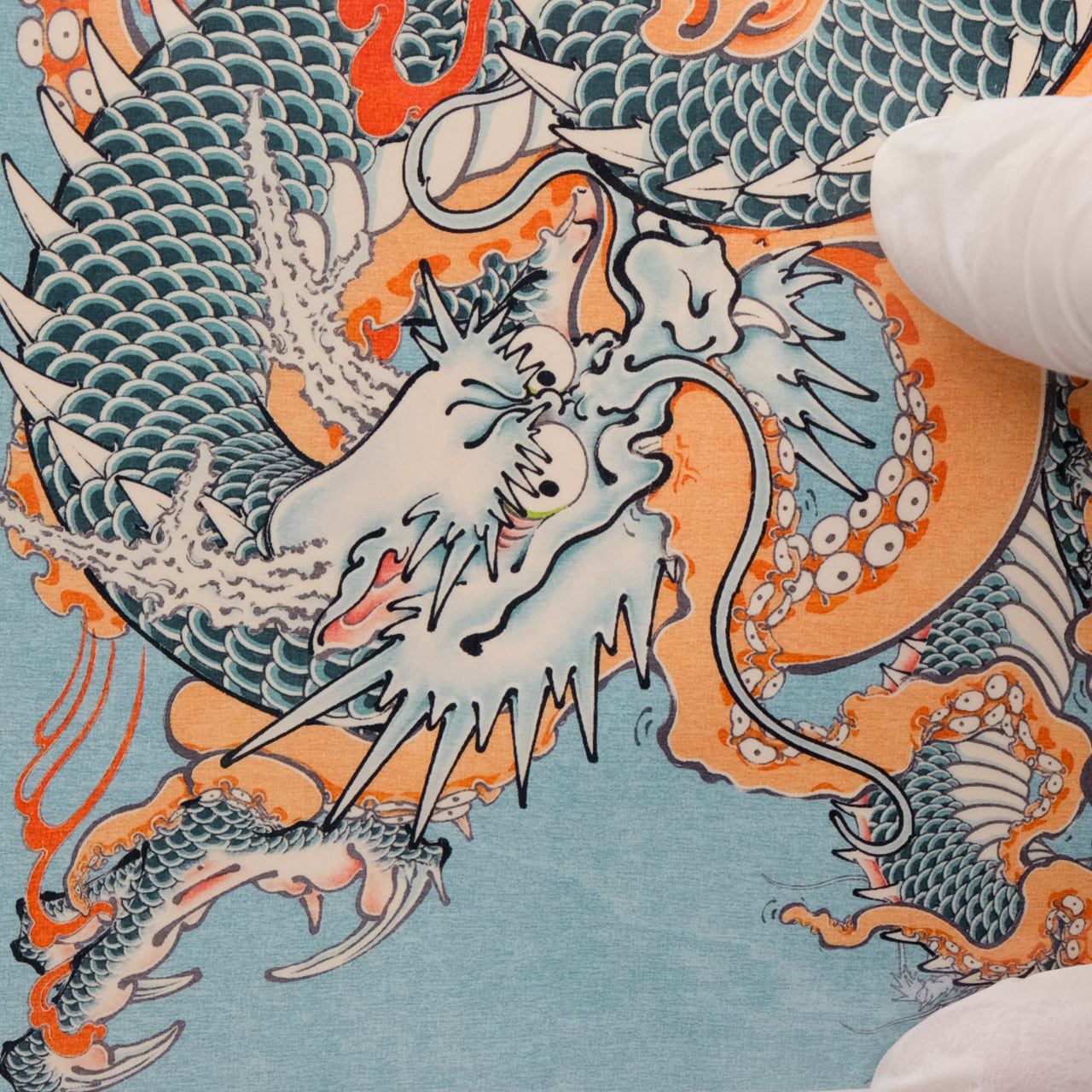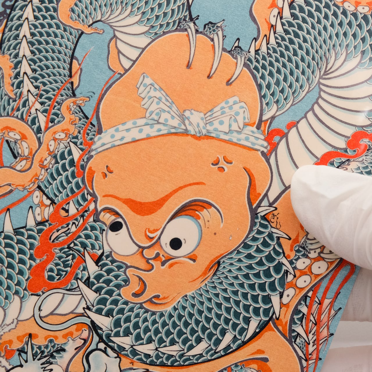 伊勢海老や上海蟹や栄螺を食べている蛸を龍が食べている浮世絵の和柄ステッカーです。